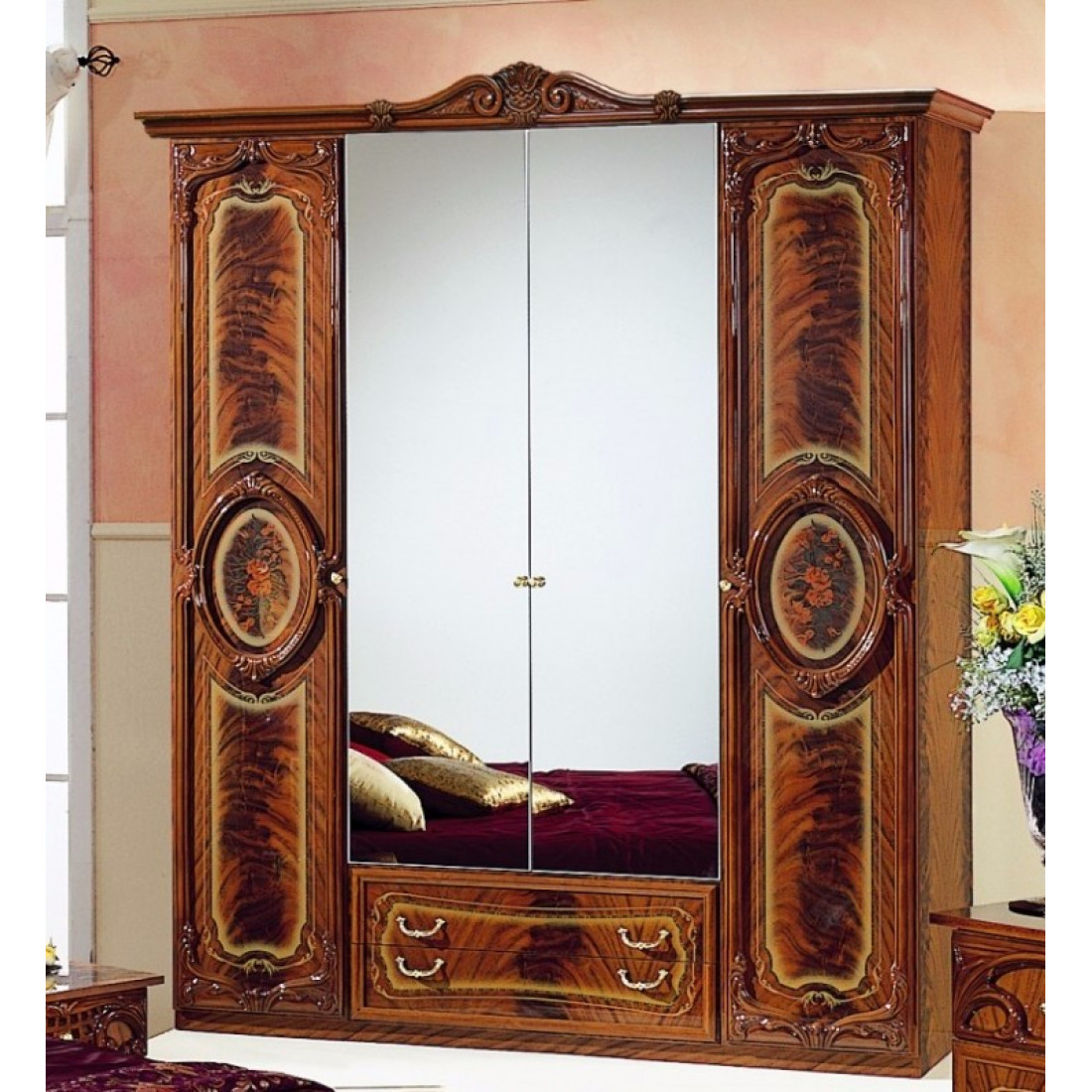 Четырехстворчатый шкаф для одежды Роза (орех) от Российской фабрики "ДИА мебель". Выполнен в классическом стиле. Ореховый цвет с глянцевым покрытием придает еще больше эстетичности этой модели. Шкаф поделен на две большие части, каждая из которых имеет не только вместительные полки для белья но и штангу для вешалок. Такой шкаф поможет с легкостью сэкономить место и удивит своей компактностью.